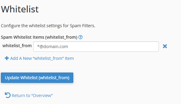 whitelist_from yazısının yanındaki kutuya izin vermek istediğiniz Domaini girin. Daha fazla Domain eklemek isterseniz tekrar Add A New whitelist_from Item yazısına tıklayın.