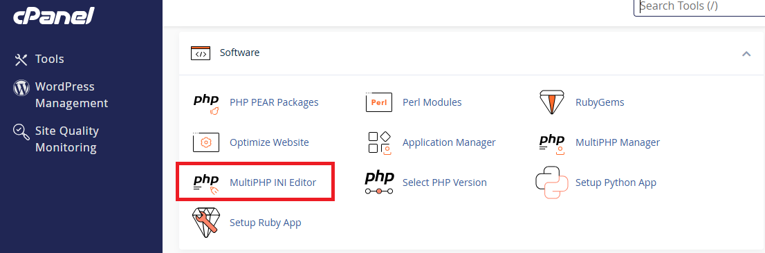 - ADIM 4: cPanel'e giriş yaptıktan sonra "Software" bölümünden "MultiPHP INI Editor" butonuna tıklayın.